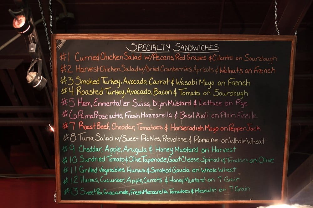 This vegetarian sandwich comes with fresh arugula, sliced Granny Smith apples, tangy honey mustard, and cheddar cheese. Served on our popular Harvest bread, packed with pecans, apricots, cranberries, figs and crystallized ginger.